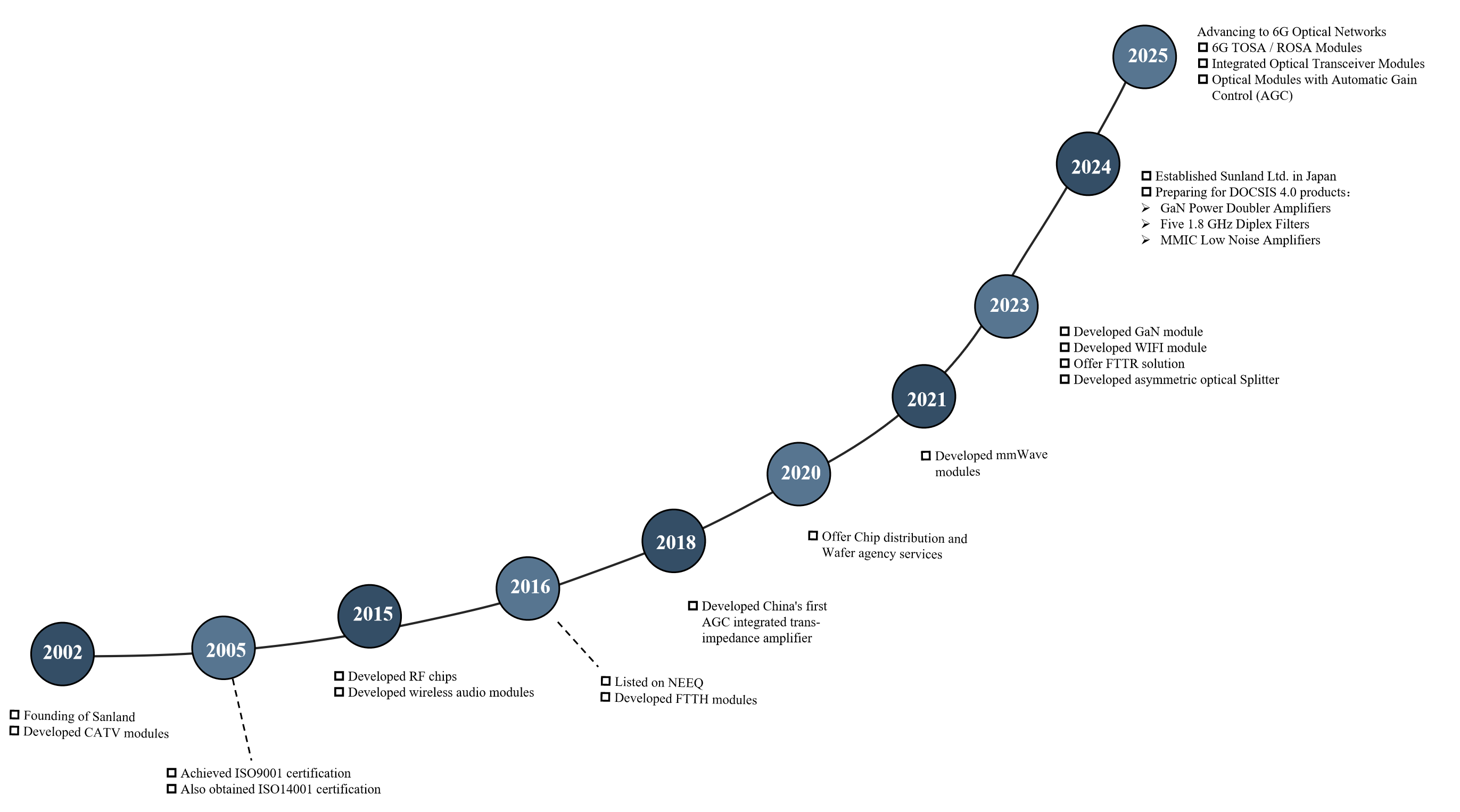 中国深圳に拠点を持つ深圳市サンランド・テクノロジー社(中国名:深圳市万和科技公司)は通信機器やチップなどの設計から研究開発、製造、販売までを一手に担う、中国の国家認定を受けた国家級企業です。主な製品とサービスにはRFチップ、RFチップモジュール、ウエハー、ファウンドリーサービス、チップ販売、ミリ波レーダーなどが含まれ、CATVネットワーク、モバイル通信ネットワーク、IoTなど、さまざまな分野で幅広く活用されています。