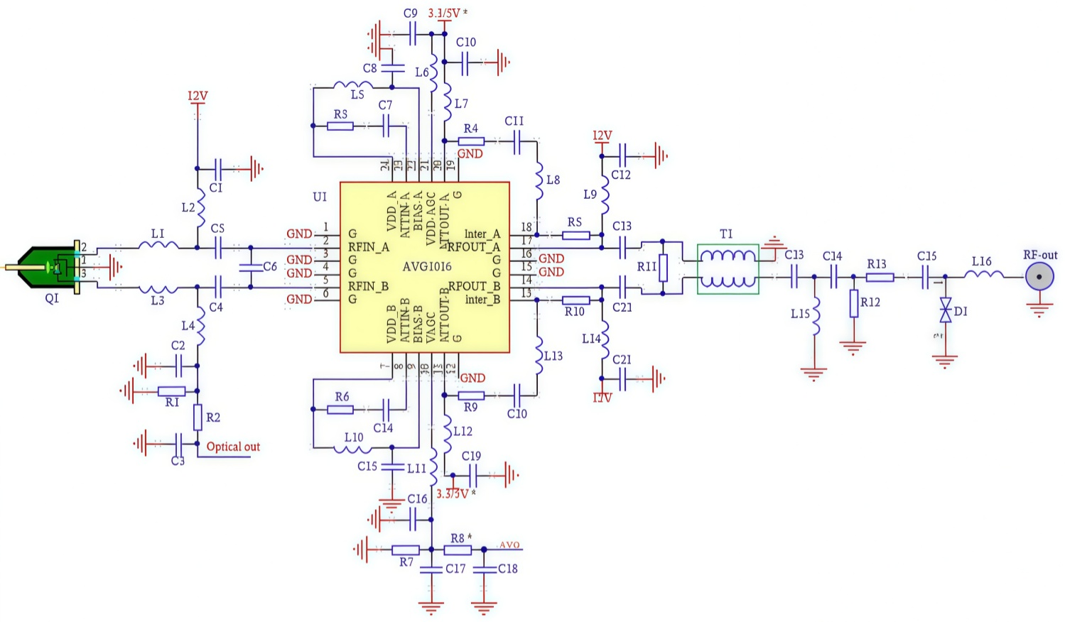 Sanland の AVG1016 は、可変ゲイン アンプです。 電圧制御アッテネータ。アンプの性能は高い 0.5um採用により直線性と低ノイズを実現 GaAs E-PHEMT プロセス。小型の 4.0 x に収納されています。 4.0 mm 24 ピン クアッド フラット ノンリード (QFN) パッケージ。それは 45MHz から最大 1000MHz まで最適に使用できるように設計されています。コンパクトな設置面積と薄型、高機能を兼ね備えた ゲインと高い直線性により、AVG1018 は理想的な選択肢となります CATVネットワークやFTTHネットワークのアンプとして。